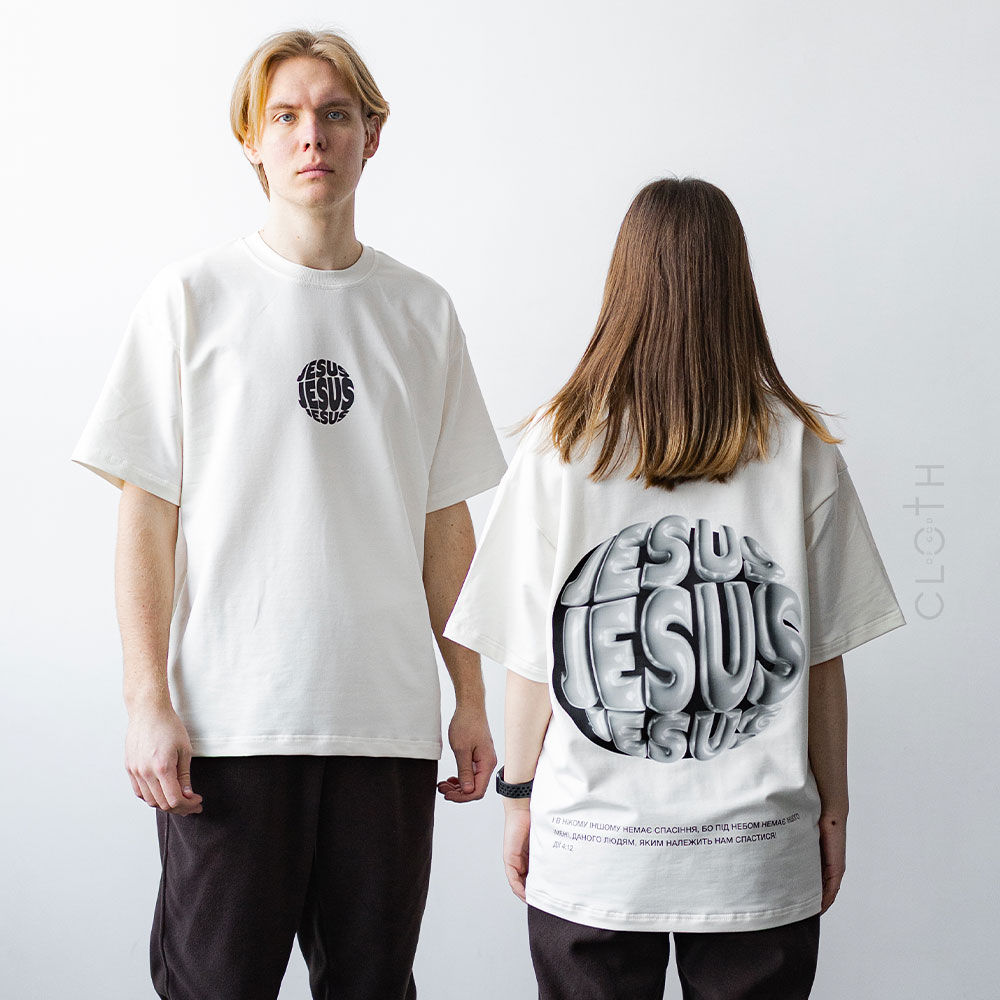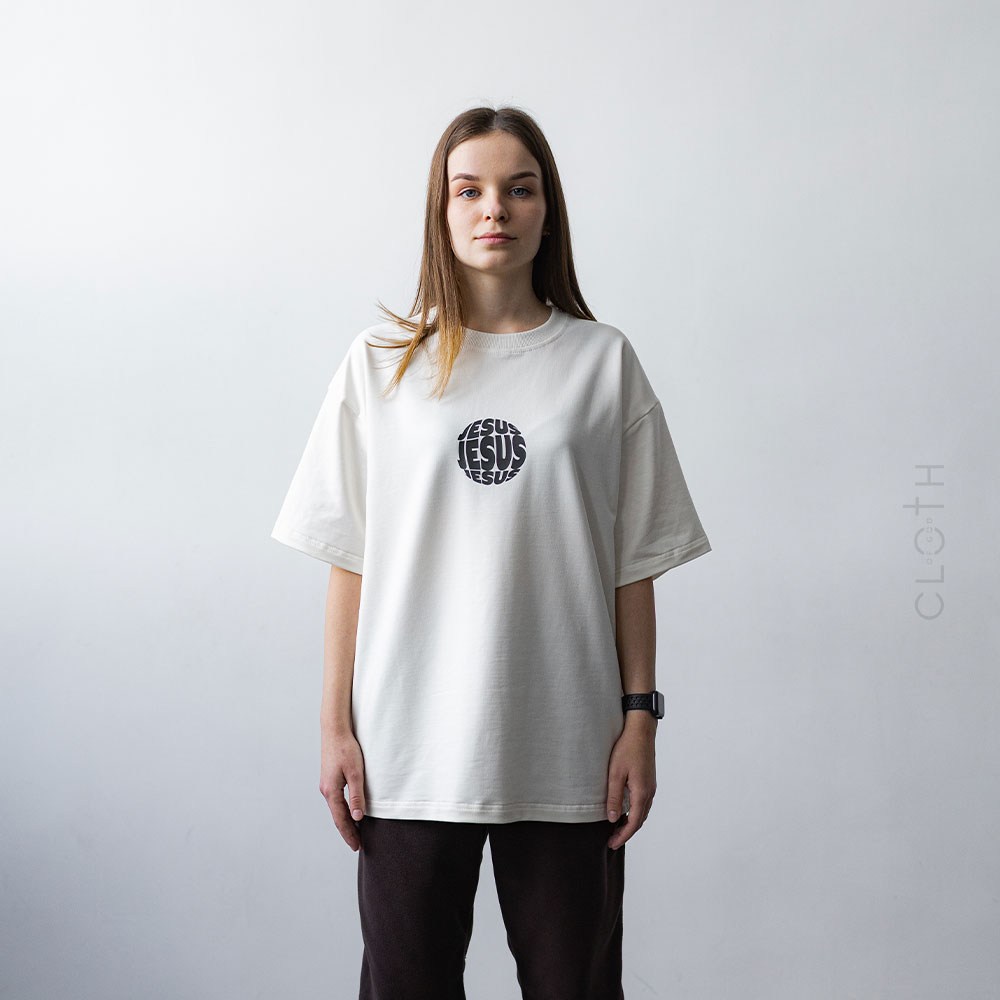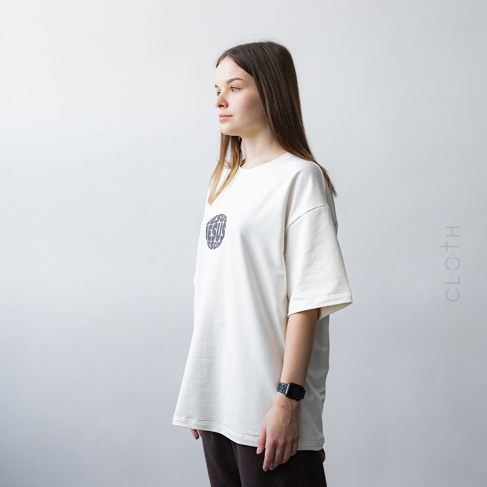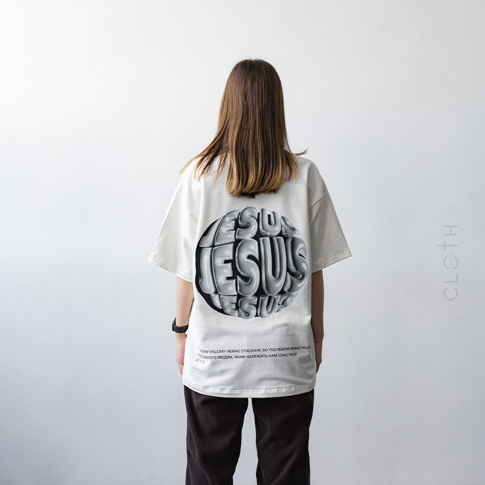 - Принт: стильний напис “Jesus”, який додає особливого змісту