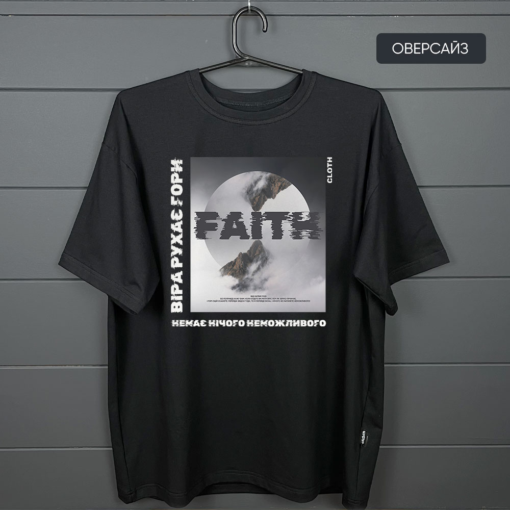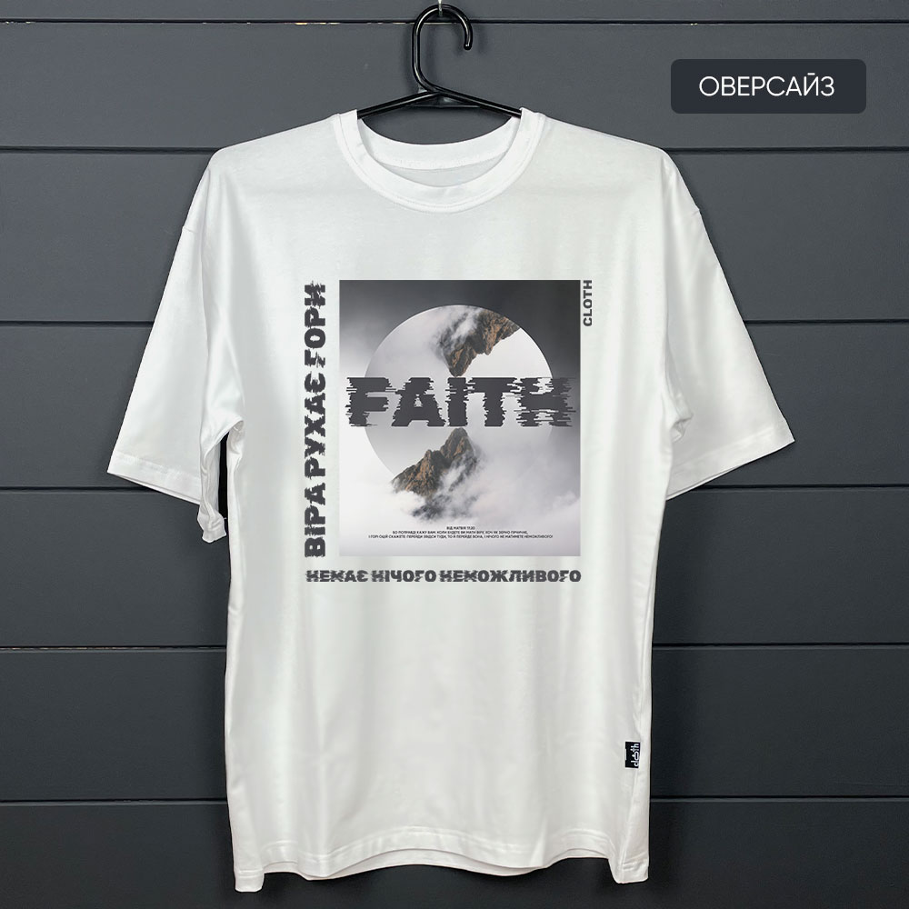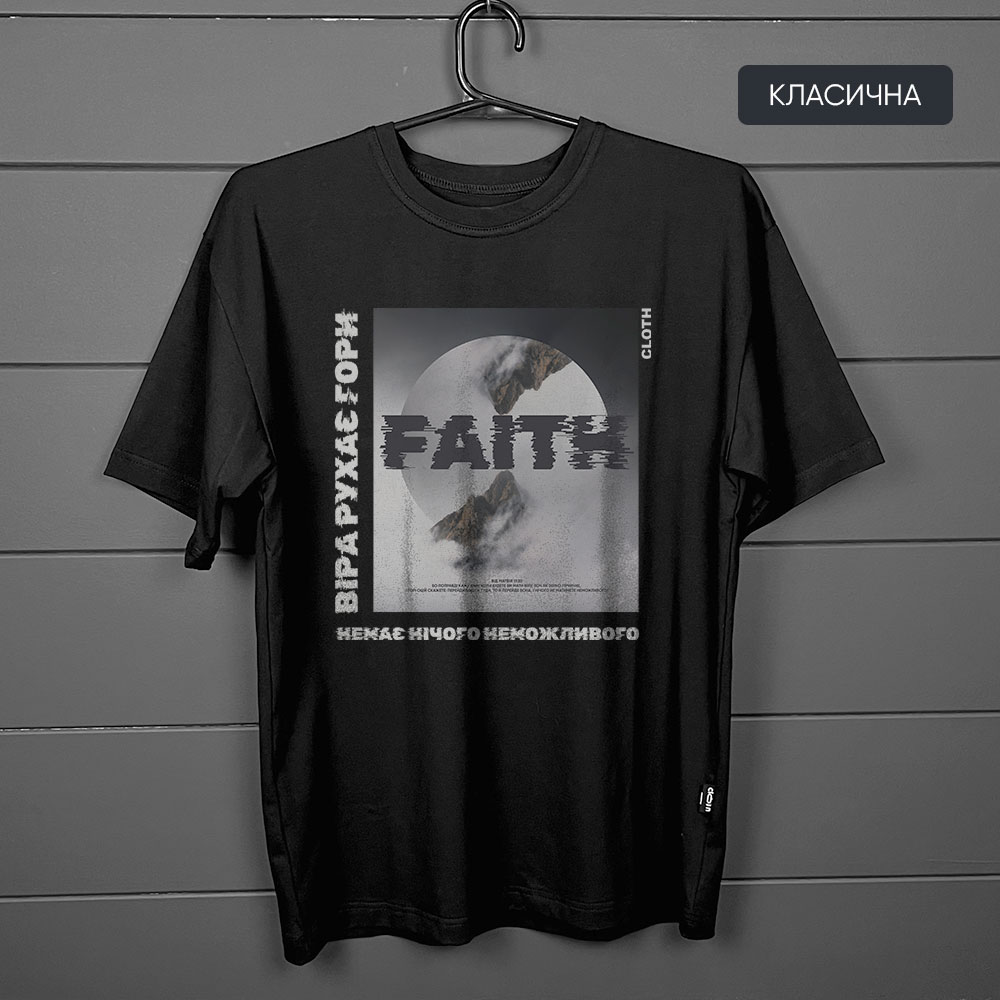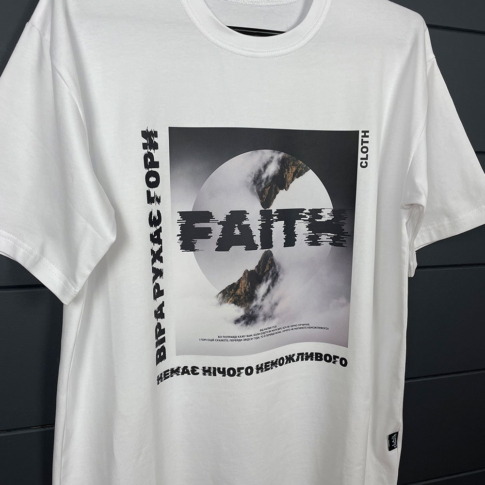 Чорна або біла футболка з принтом “FAITH – віра рухає гори” і логотипом бренду “Cloth”. На малюнку зображені гори написом зі святого письма: Бо поправді кажу вам: коли будете ви мати віру, хоч як зерно гірчичне, і горі оцій скажете: Перейди звідси туди, то й перейде вона, і нічого не матимете неможливого! від Матвія 17:20