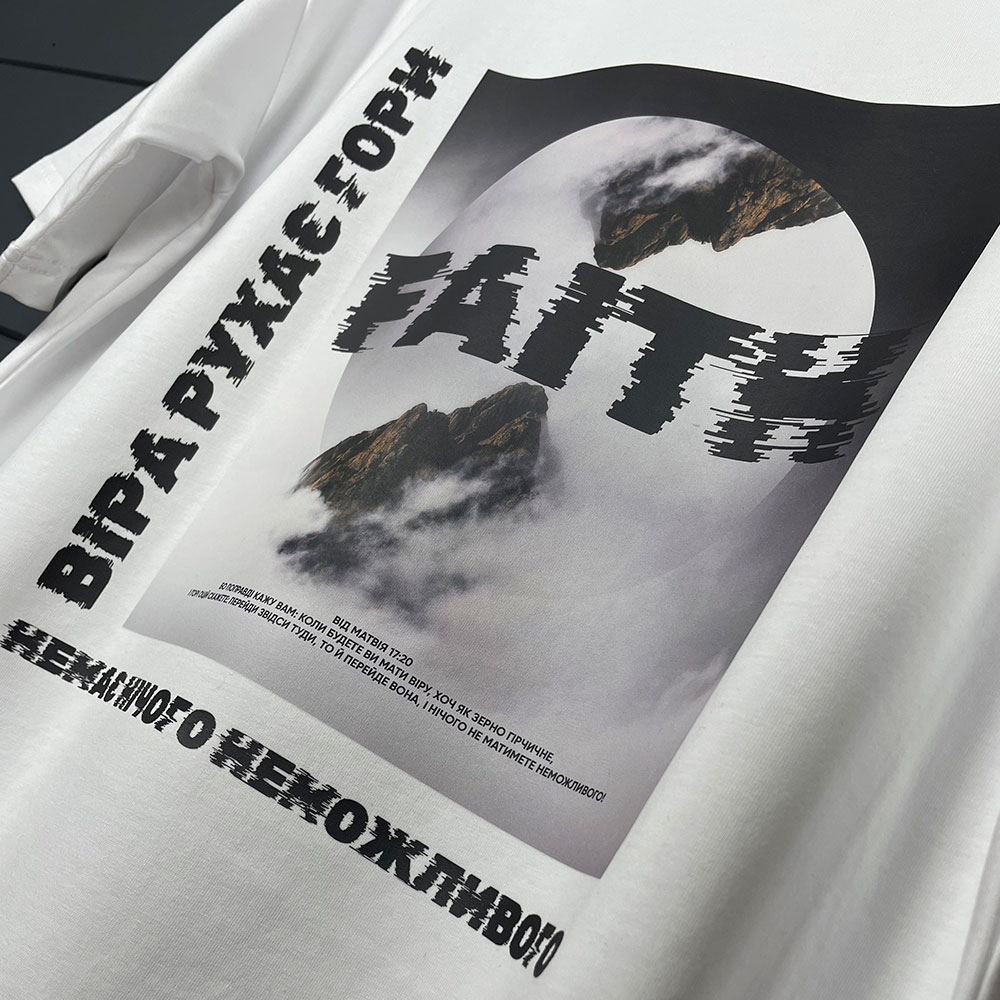 Футболка з принтом “FAITH – Віра рухає гори”. Цей принт має глибокий смисл і висловлює ідею, що віра може перемогти будь-які перешкоди, навіть найвеличезніші гори. Зображення цього принта на футболці служить як нагадування про важливе послання, що віра може надихати нас до досягнення неможливого.