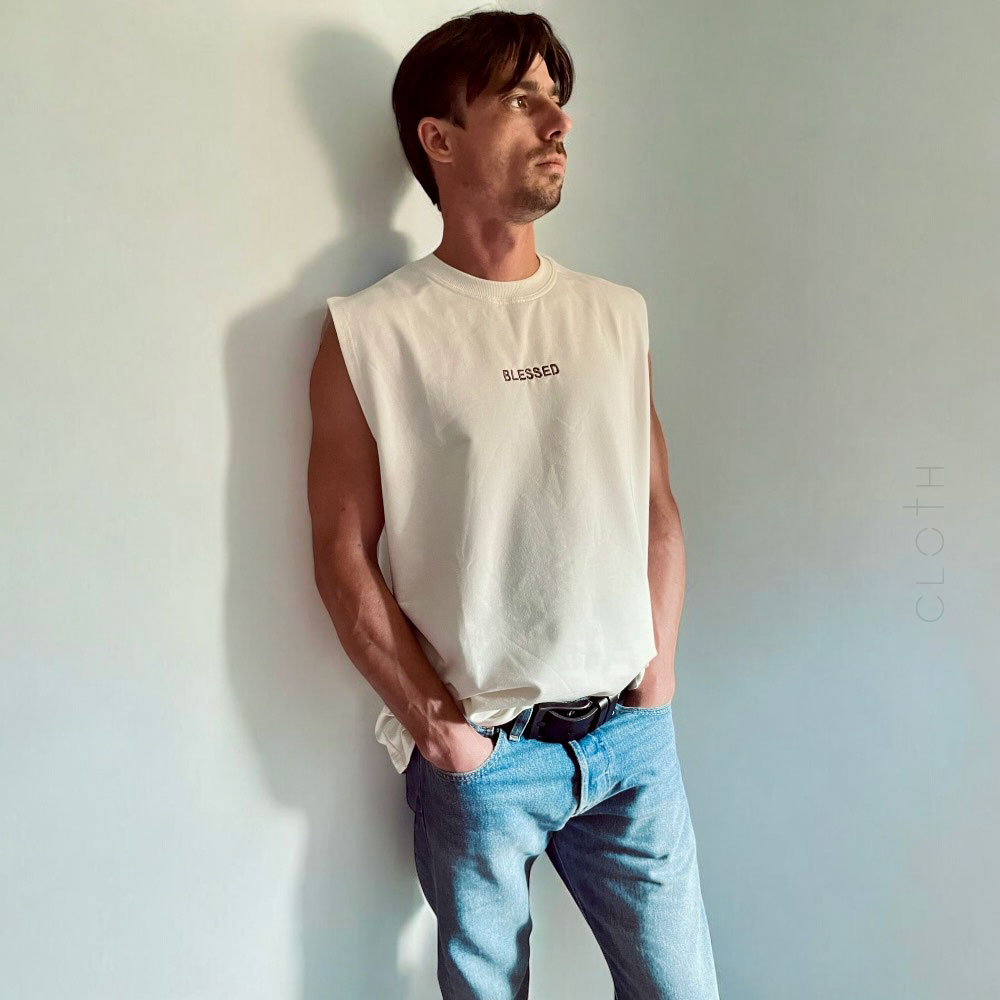 Майка з вишивкою Blessed в 4-х кольорах. На моделі розмір XS-S. Зріст моделі 167 см
